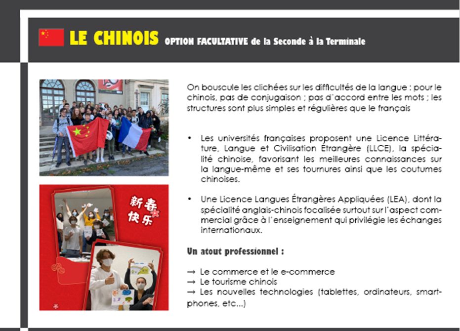 Arts du spectacle vivant (Théâtre), Arts visuels (Cinéma), espagnol, allemand, chinois en L.V.2, latin, section européenne,parcours santé, enseignement technologique tertiaire (STMG), sections de techniciens supérieurs.